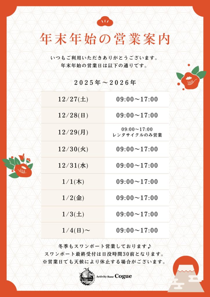 いつもActivity Base Cogue/アクティビティベースコグーをご利用いただき誠にありがとうございます。2025年1月の営業日は下記カレンダーをご確認… - 2025年-2026年 年末年始営業カレンダー